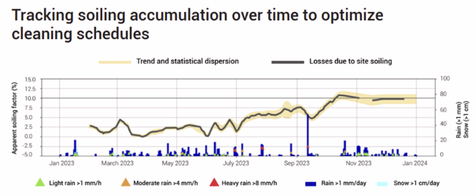 The graph above shows how the soiling factor evolves over time alongside major precipitation events. This information helps reveal the site’s soiling and natural cleaning dynamics and supports the design of an optimized cleaning schedule by balancing cleaning costs, cleaning effectiveness, and electricity prices.