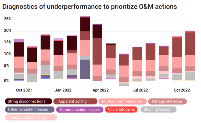 The graph above illustrates how energy losses in a PV installation evolve over time. It shows the breakdown of underperformance as a percentage of the system’s expected theoretical output, based on environmental conditions and equipment performance.